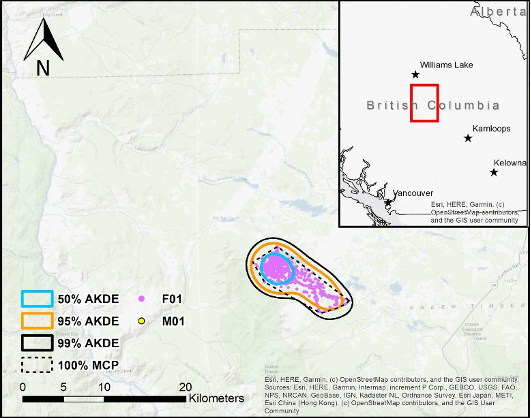 Acknowledgements: This work was conducted by the British Columbia Mesocarnivore Team (Ministry of Water, Land and Resource Stewardship) with support from the BC Trappers Association. All wildlife captures and handling were conducted under the appropriate wildlife and animal care permits, and supervised by wildlife veterinarian Malcolm McAdie. GPS location data processing and analysis was done by Jessica Buskirk and Katie Moriarty.